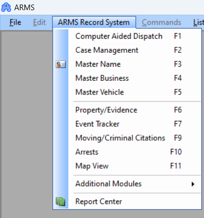 If the user sees the first letter of a menu underlined, this indicates that the user can hold down the Alt key and type that letter to pull down the menu. For example: using Alt-A pulls down the ARMS Record System Menu.
