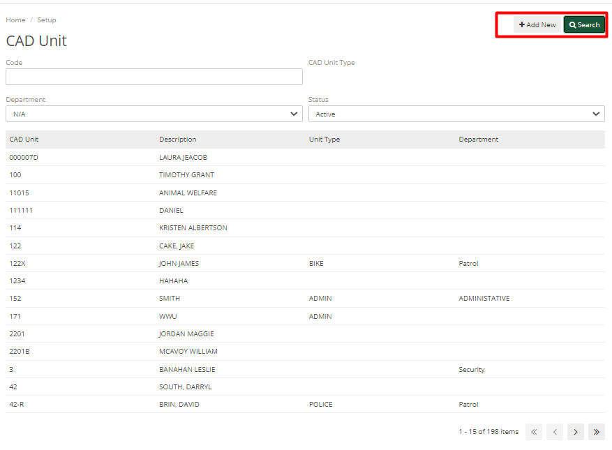 The search bar gives the Admin the ability to search through existing CAD Units, and the Add New button will allow them to create a new CAD unit.