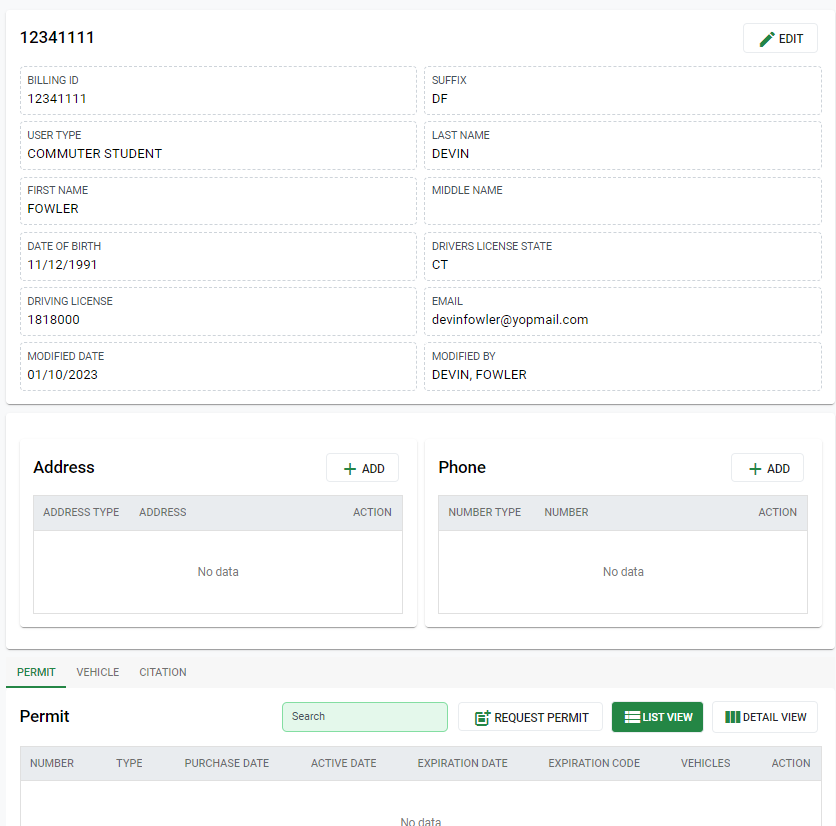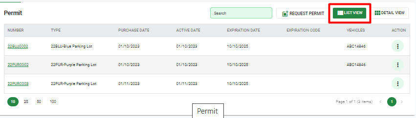 All Permits, Vehicles, and Citations can be viewed at the bottom of the page. New permits can be requested by selecting that option within the Permit tab. New vehicles can also be linked to the user by selecting the New option within the Vehicle tab.