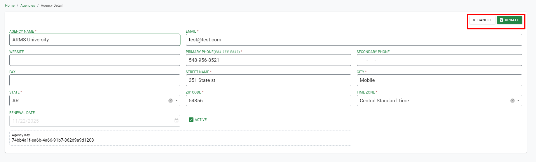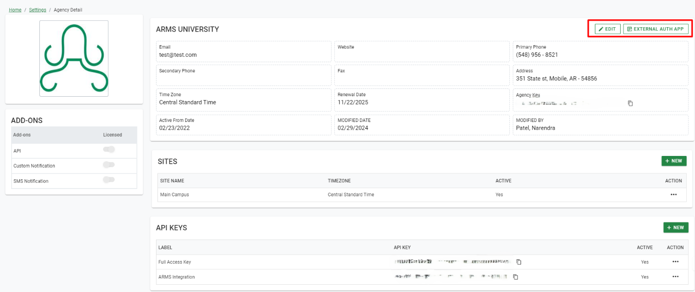 This section allows Agency Admin to manage basic department details like Agency Name, Address, Primary Phone Number, Email, Time zone, Agency Key, Active from date, Renewal Date, Modified date, Modified by, Sites, API Keys and Add Ons.
