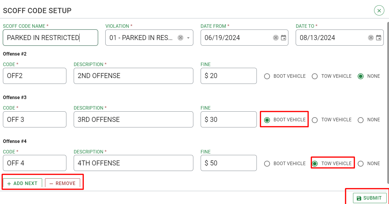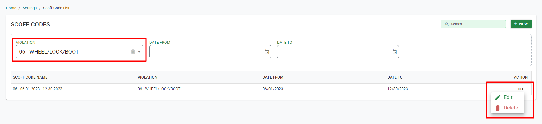 To add a scoff code, click on “New”, a dialog will pop up in which the admin needs to select the violation and date range for the scoff code. After selecting the violation and date range, the Admin can set all details for each subsequent violation infraction, including Fine, and whether to Boot/Tow the vehicle.