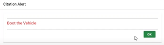 As soon as the officer enters the permit number to create a citation it will display an alert with the message “Boot the Vehicle.” This alert appears due to the configuration of the violation independent rule. If the end-user pays all the previous citations, then this rule will not apply, and the alert will not show.