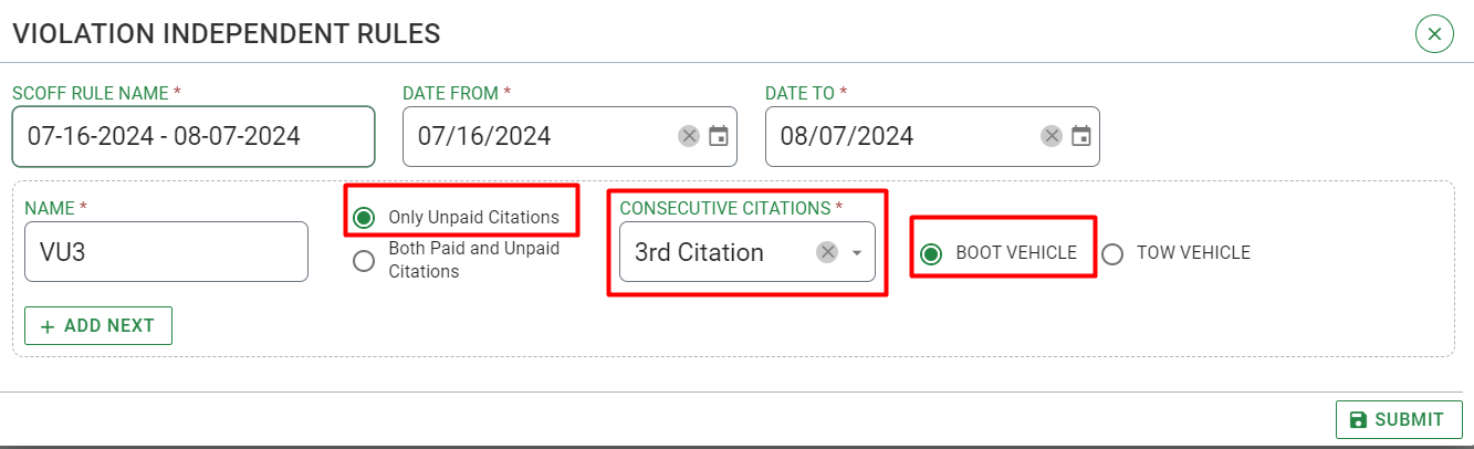 Violation Independent Rules are like Scoff Codes, but they count the citation regardless of their violation. For example, if someone has 2 unpaid citations, upon receiving a 3rd citation, the officer will be alerted to boot the vehicle if an independent rule violation has been created for that circumstance. This can be set for both Paid and Unpaid Citations.