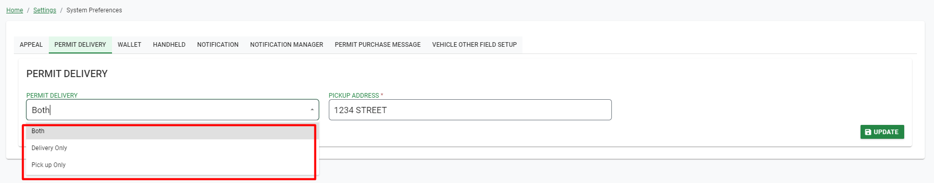 Permit Delivery – This tab enables the Admin to set the Permit Delivery and the Pickup Address. Permit Delivery can be set for delivery only, pickup only, or both. The Pickup Address can also be entered if that option, or both, is selected. This configuration is required before a permit can be requested.