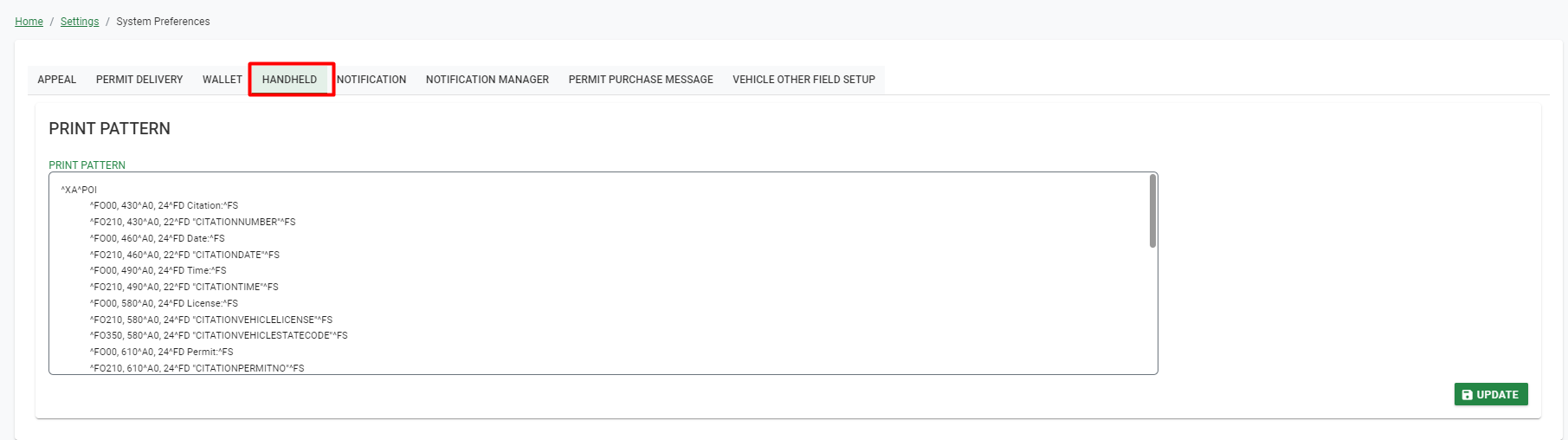 Handheld – This section allows the admin to configure printing patterns for Citations printed from handheld devices.