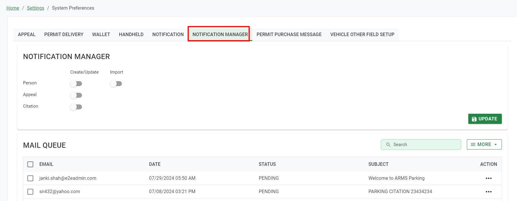 Notification Manager – The agency can set when consumers will receive emails under this section. Administrators have a variety of toggle options to turn on and off notifications.