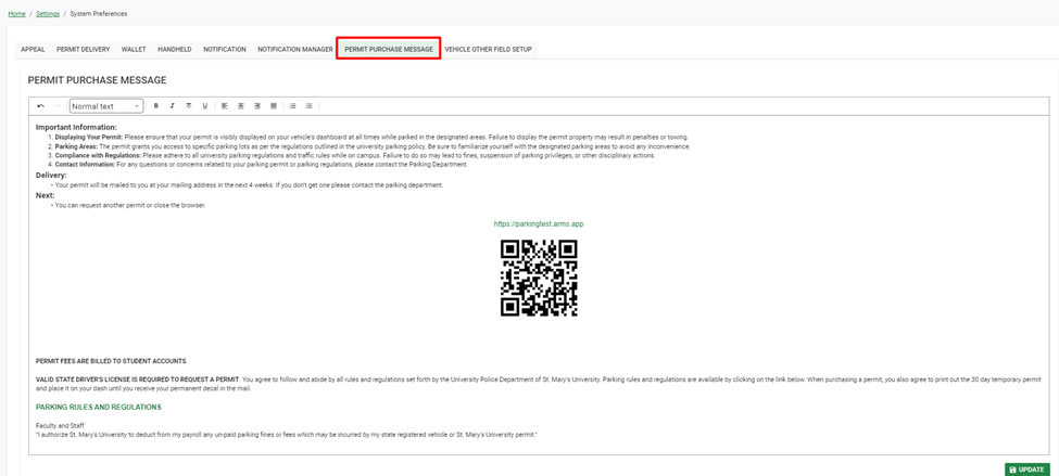 Permit Purchase Message – From this tab, the agency can set the message that will be shown to users when they purchase a permit.