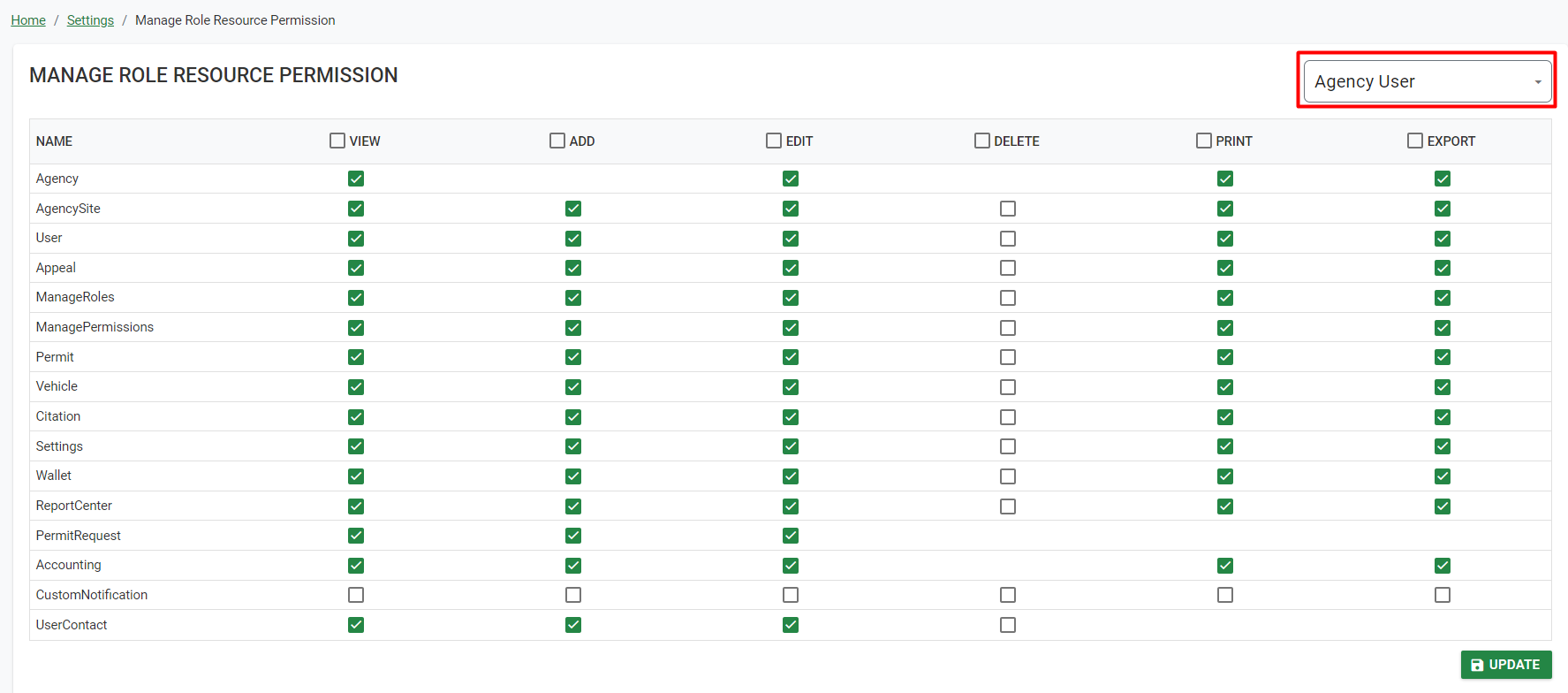 Manage User Permission- This will redirect admin to Manage role resource permission page with selected user.