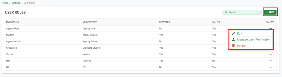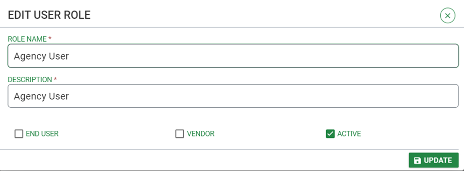 Edit/Add New Roles – The Admin can add or edit roles. When editing roles, they can be marked for end-users, vendors, as well as checked Active.