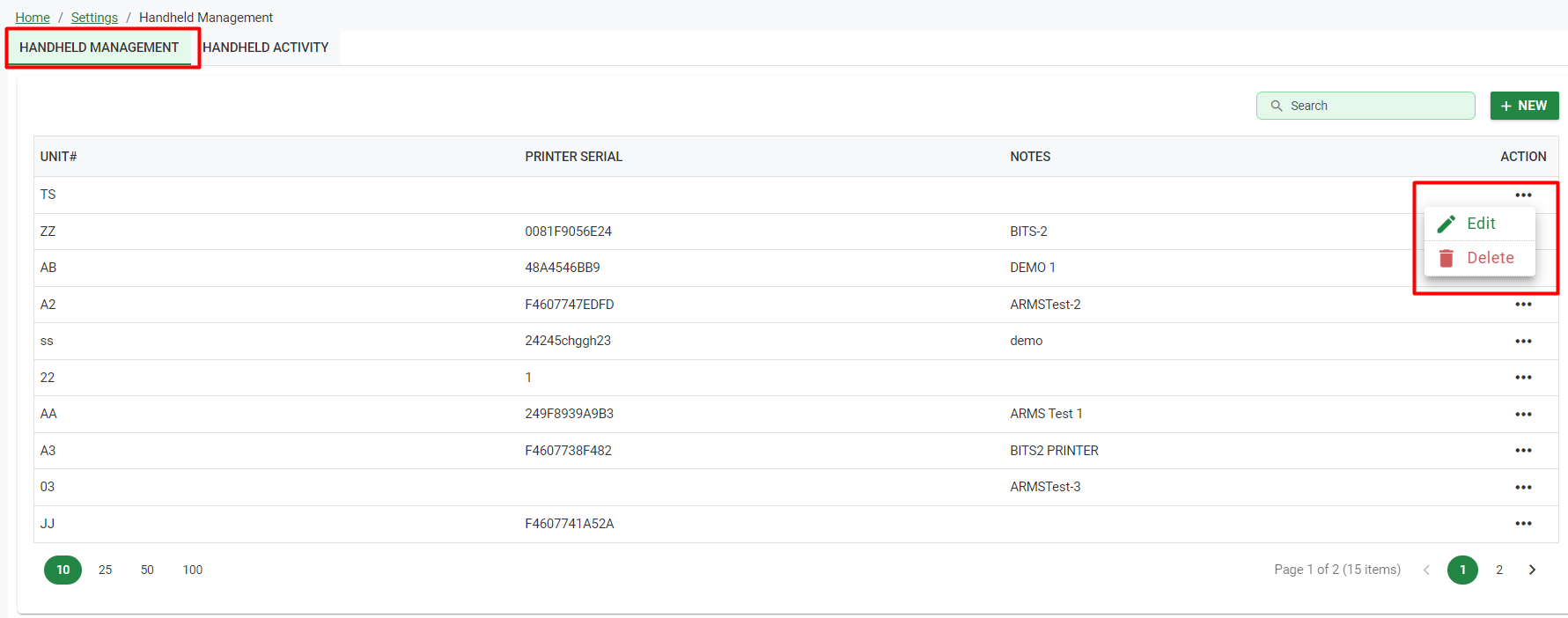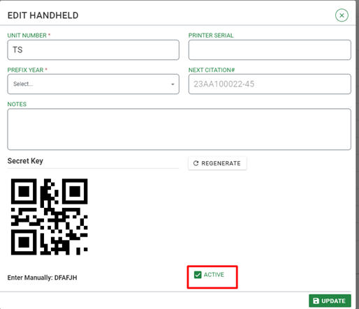 Add/Edit Handheld – Selecting New allows the Admin to add a new handheld device to their system, setting its Unit Number, Printer Serial, and inputting Notes. Once the handheld has been added to the system, the Admin can select the Edit Action, where they can get the Secret Key needed to input into the physical handheld device, which can be entered manually with the displayed code, or by scanning the QR code with the handheld itself. Once finished, the handheld is ready for use by the department.
