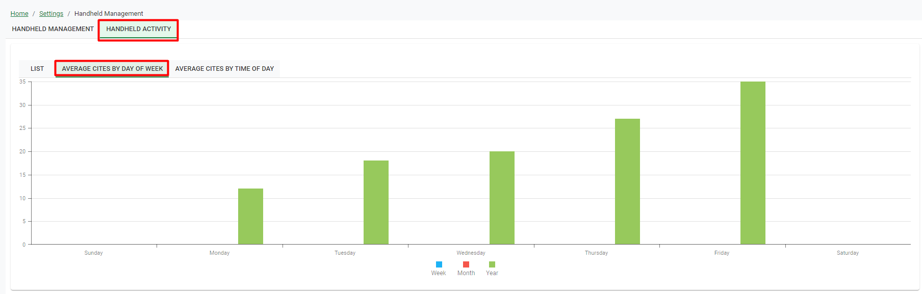 Handheld Activity – This tab displays citation statistics for all agency handhelds. The default List shows all handhelds, their Current Cite#, and the total number of citations issued, broken down for each handheld by Week, Month, and Year. Average Cites By Day Of Week displays citation statistics in a bar chart for each day. Average Cites By Time Of Day displays citation statistics in a line chart for each hour of the day.