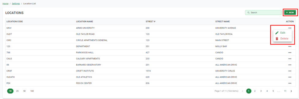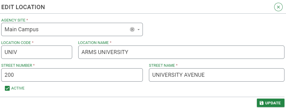 Add/Edit Locations – Locations can be added, and edited, with each requiring information for Agency Site, Location Code, Location Name, Street Number, and Street Name. They can also be marked Active or Inactive, as needed.