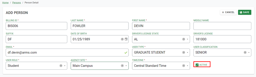 Clicking New allows the Admin to create a new name record. They can then enter, or select, all needed person details like: Billing ID, Last Name, First Name, Email, User Type, User Role, Agency site and Time zone.