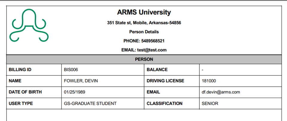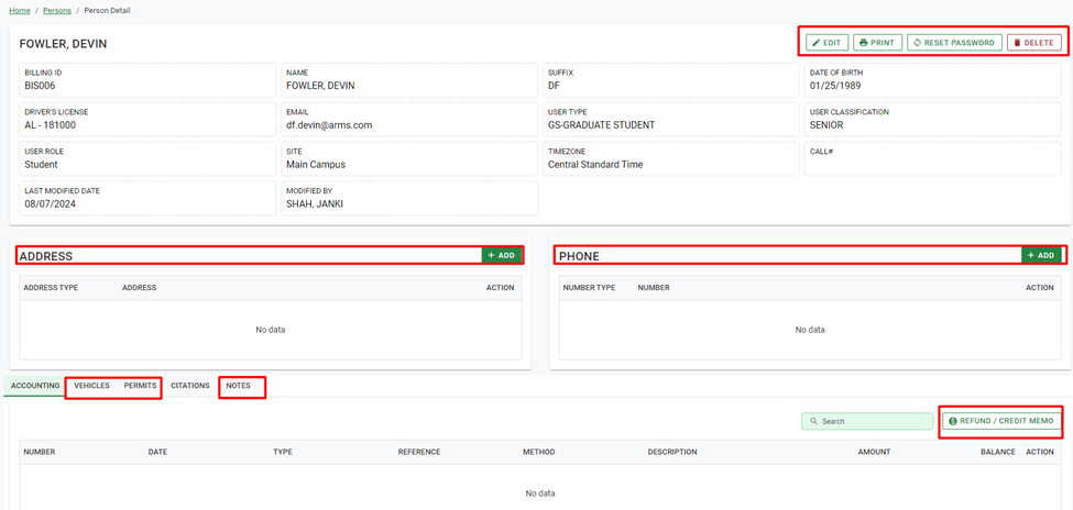 Once a new record is created, its Person Detail page will be displayed. Here the Admin can add details like Address, Phone, Permits, Vehicles, or enter Notes for the record. They can also reset the user's password, print their record or delete the record.
