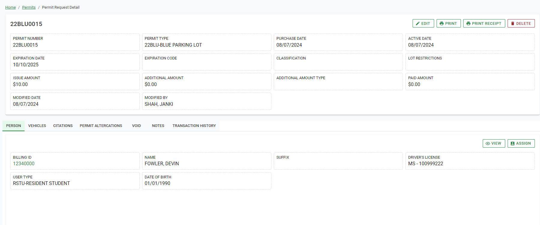 Step 1 – Add Person detail: Only existing people within your ARMS Parking system can be added to a new permit. If already entered the system, desired person can be searched, and attached, by their billing number.