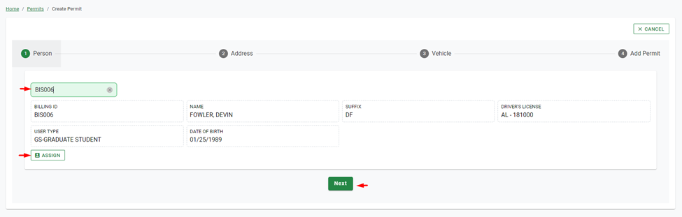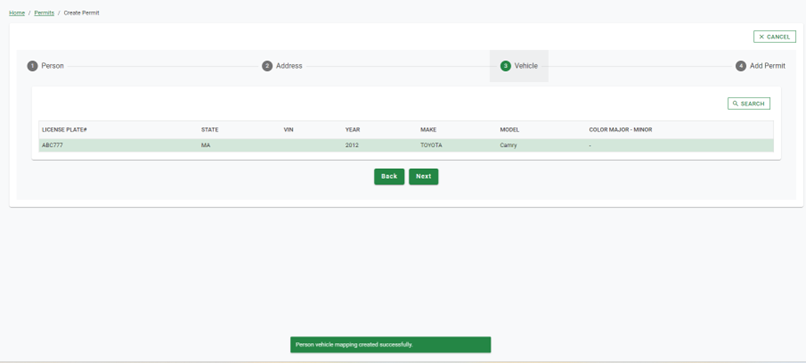If the person has multiple vehicles displayed, ensure the one highlighted in green is the vehicle intended for the permit before clicking Next.