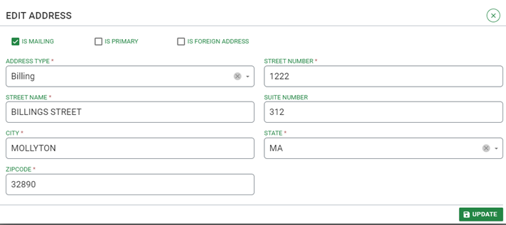 Step 2- Add an address: This section will display the person's existing address(es). The Admin can edit the existing one(s), and add a new one if needed. If a person has multiple addresses, only one can be set as their Primary address.