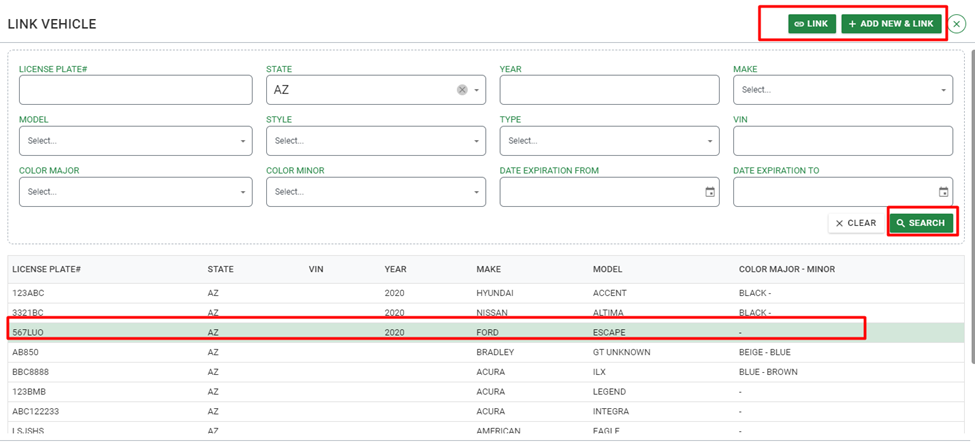 Step 3 – Link a vehicle: Existing vehicles linked to the person will automatically be displayed. If the desired vehicle is not listed, clicking Search allows the Admin to search for it using vehicle details. If it is not in the system, it can be added by selecting Add New & Link.