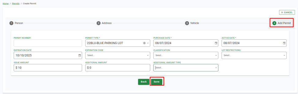 Step 4 – Enter permit details: Here the Admin will input, or select, all required permit details, including Permit Number, Permit Type, Purchase Date, Active Date, et cetera.