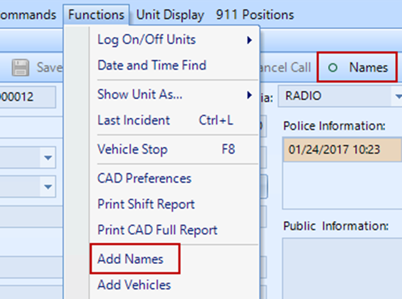 Names can be added to CAD events by going to the CAD Functions menu and selecting the Add Names menu item or by selecting the Names field in the top right of the CAD screen. The Add Names window allows users to make entries into the Master Name File that are associated with a CAD event number. The CAD Add Names window will also show all names that are associated with the current CAD event.