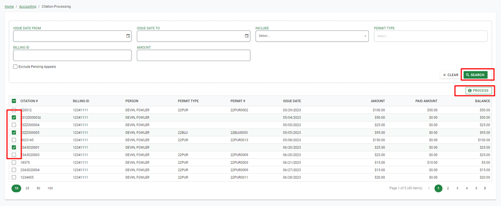 All the Citations generated will be listed in this section. It will display information like Citation Number, Billing Number, Person, Permit Type, Issue Date, Amount, and Paid Amount for each Citation.