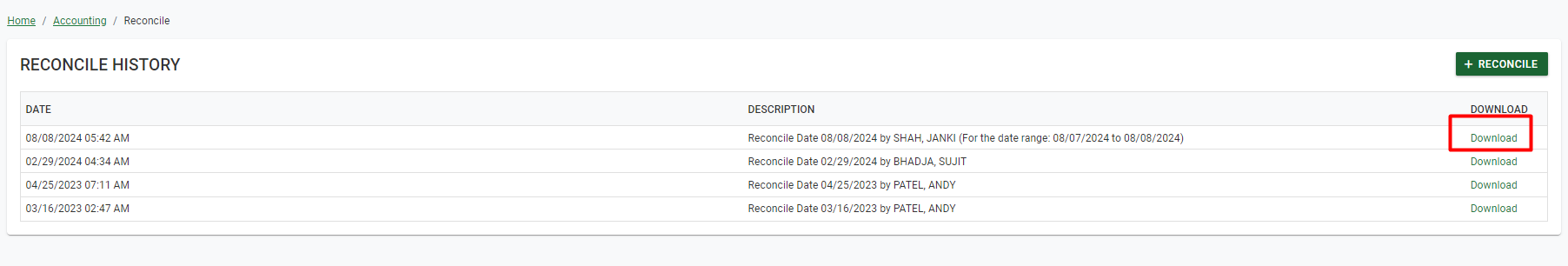 A spreadsheet report of each reconcile can be saved by clicking the Download option.