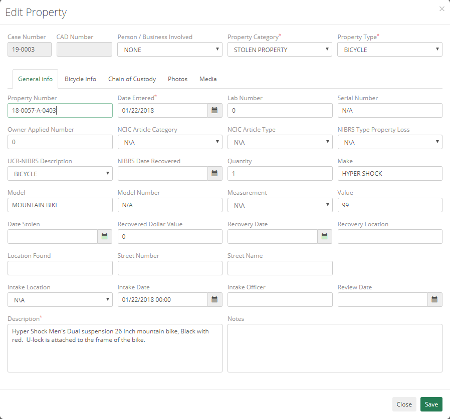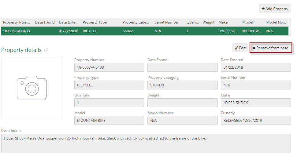 Property Type – guns, bicycle, etc. |