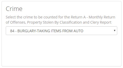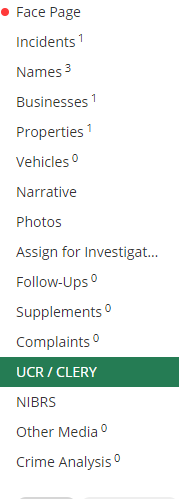 In the Case Management module while filling out a Case there is a tab for UCR. This is where you will input and UCR or Clery reportable data into a Case. Be aware that you will need to have your Crime Codes set up correctly and they will need a UCR data code and a Clery Act Data code (if applicable).