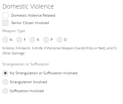 The third section of the UCR Review is the Domestic Violence section. This section allows you to mark whether the Case was Domestic Violence Related, if a Senior Citizen was involved, and what Weapon Type was used, or if there were none used.