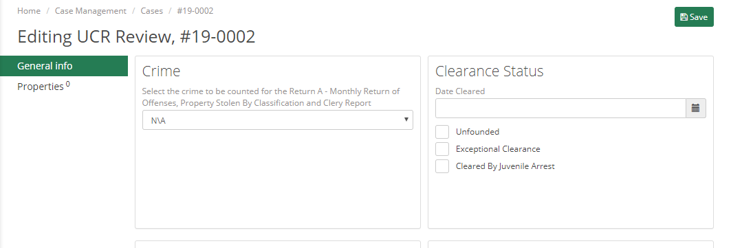 After selecting the “Start UCR Review” button you will be brought to a screen with two tabs: General Info and Properties. In the General Info tab, you will see seven different sections: Crime, Clearance Status, Domestic Violence, Vehicle Recovery, Law Enforcement Officers Killed or Assaulted, Clery ACT – Title IX – SaVE ACT, and Arson.