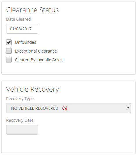 Be aware that if a UCR Review is marked at Unfounded, you will be unable to choose a Vehicle Recovery type or insert a date.
