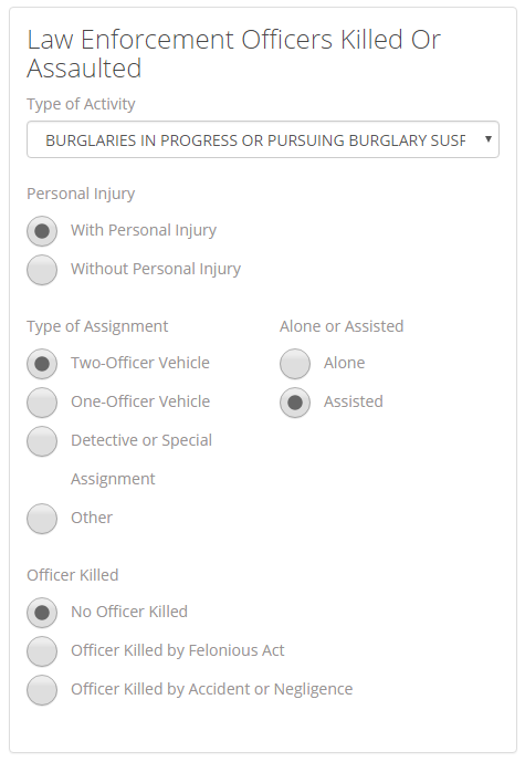 The fifth section of the UCR Review is the Law Enforcement Officers Killed or Assaulted section, also known as LEOKA. This section allows you to report if an officer is killed or assaulted. You can choose the Type of Activity that the officer was killed or assaulted during. You can select whether there was a personal injury or not, what type of assignment was involved, whether the officer was alone or assisted, and whether the officer was killed and whether it was by felonious act or by accident or negligence.