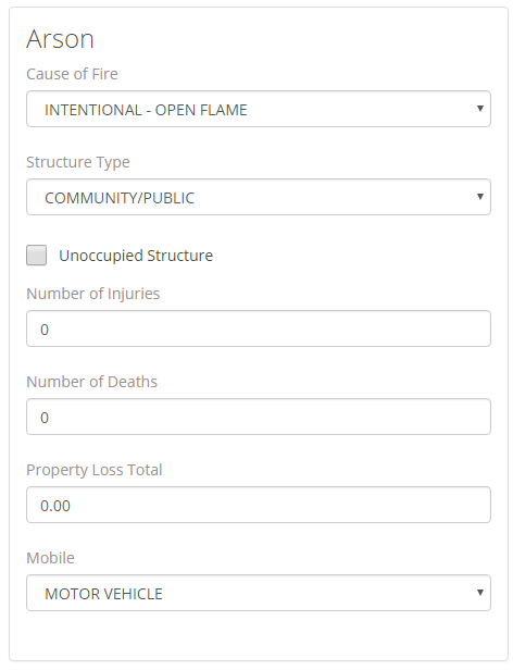 The seventh section of the UCR Review is that Arson section. This section allows you to report if there was a fire involved in a Case. You can select the Cause of the Fire, the Structure Type involved, mark whether the structure was Unoccupied, input the Number or Injuries and Number of Deaths, input the Total monetary value of Property Loss, and if a Mobile was involved in the fire.