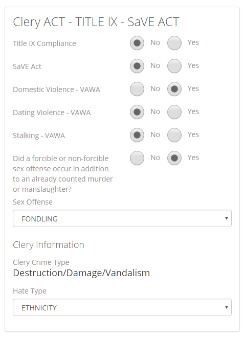The sixth section of the UCR Review is the Clery ACT – TITLE IX – SaVE ACT section. This section allows you to report a Clery reportable crime and whether that crime is related to Title IX, the SaVE Act, or VAWA. For a crime related to VAWA you can choose whether the crime involved Domestic Violence, Dating Violence, or Stalking. You can also mark whether the Case involved a forcible or non-forcible sex offense in addition to an already counted murder or manslaughter, and what that sex offense is. If your Crime Code is set up with the correct Clery Act Data, when you select that crime in the first UCR Review section, Crime, then it’ll automatically fill out the Clery Crime Type in this section. Then you can select the Hate Type if the Case involved a Hate Crime.