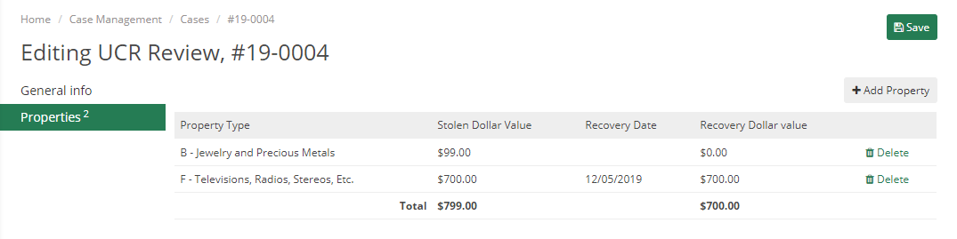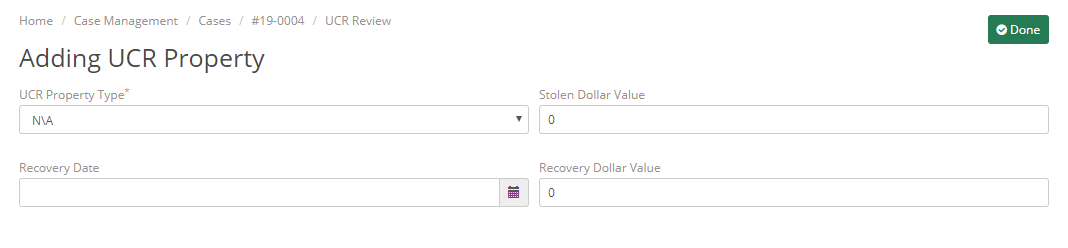 You can also choose to add a property that is involved in the UCR Review here. Just like on the display page, when adding a Property here you can add the UCR Property Type, Stolen Dollar Value, Recovery Date, and Recovery Dollar Value.