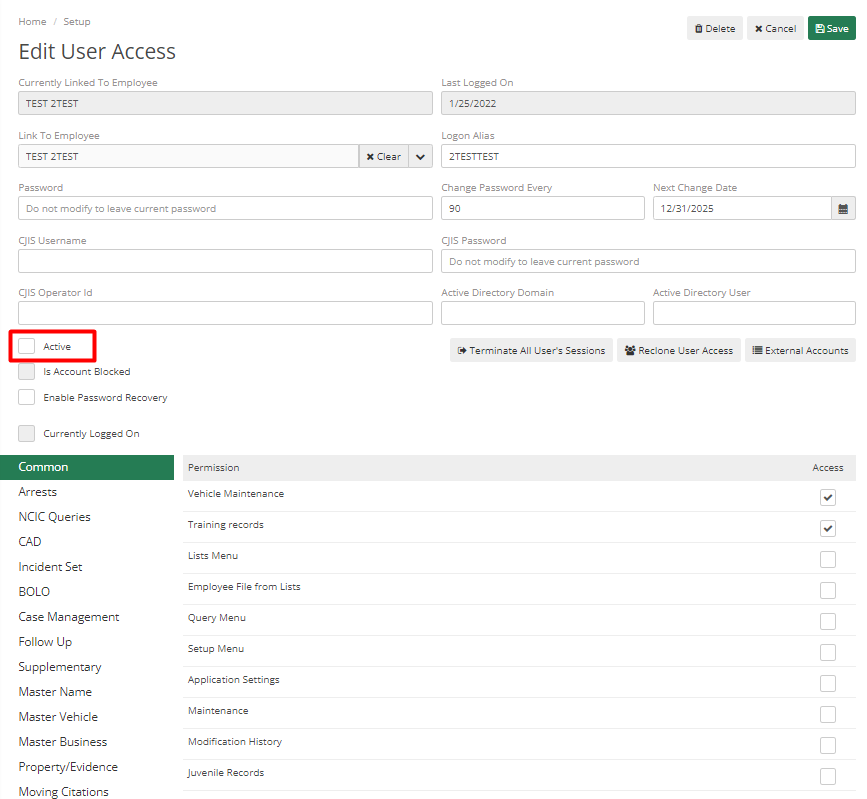Next go to the Employee tab, locate their Employee File and deselect the checkboxes for Active and Dispatchable. After this, they can no longer be assigned a case report.