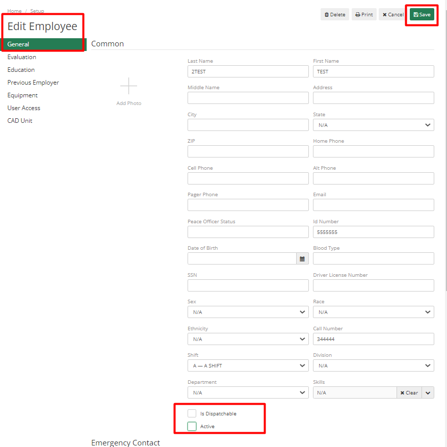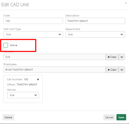 Lastly, locate the employee's CAD Unit (if they have one) and deselect the Active checkbox. This will stop the employee's CAD Unit from appearing in CAD.