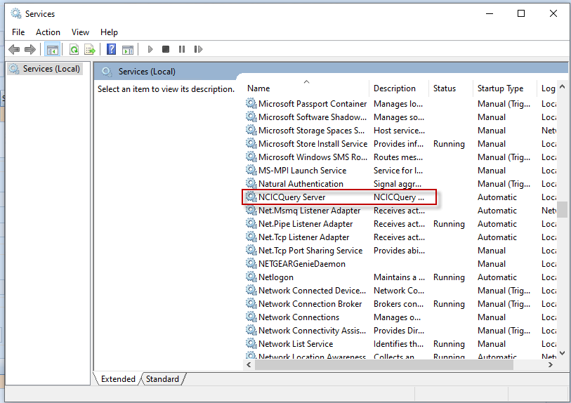 Step 3: In Services select 'NCICQuery Server'. Then select 'Stop the Service'