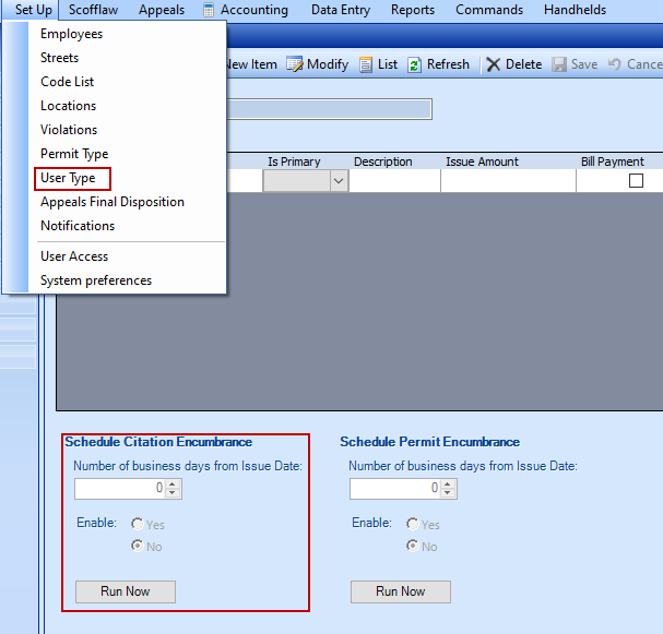 You can change the amount of time before the citation is transferred in the Set-Up tab in the parking module. Select User Type then the User Type you want to affect. Select the Schedule Citation Encumbrance and put the desired amount of time. The transfer will be reflected in accounting as Paid: Encumbered.