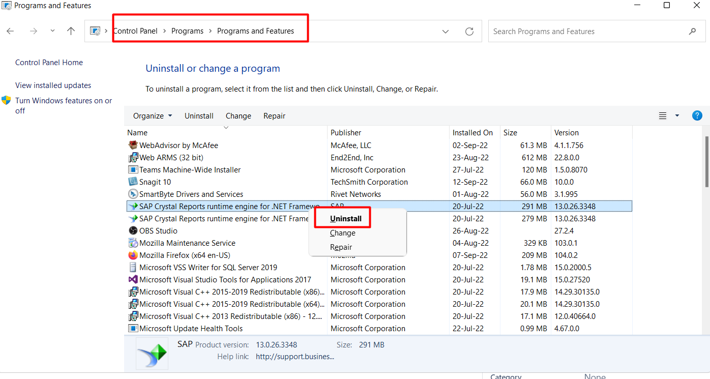 Step 1: Uninstall the current Crystal Reports installed on the Machine by going to Control Panel> Uninstall Programs.