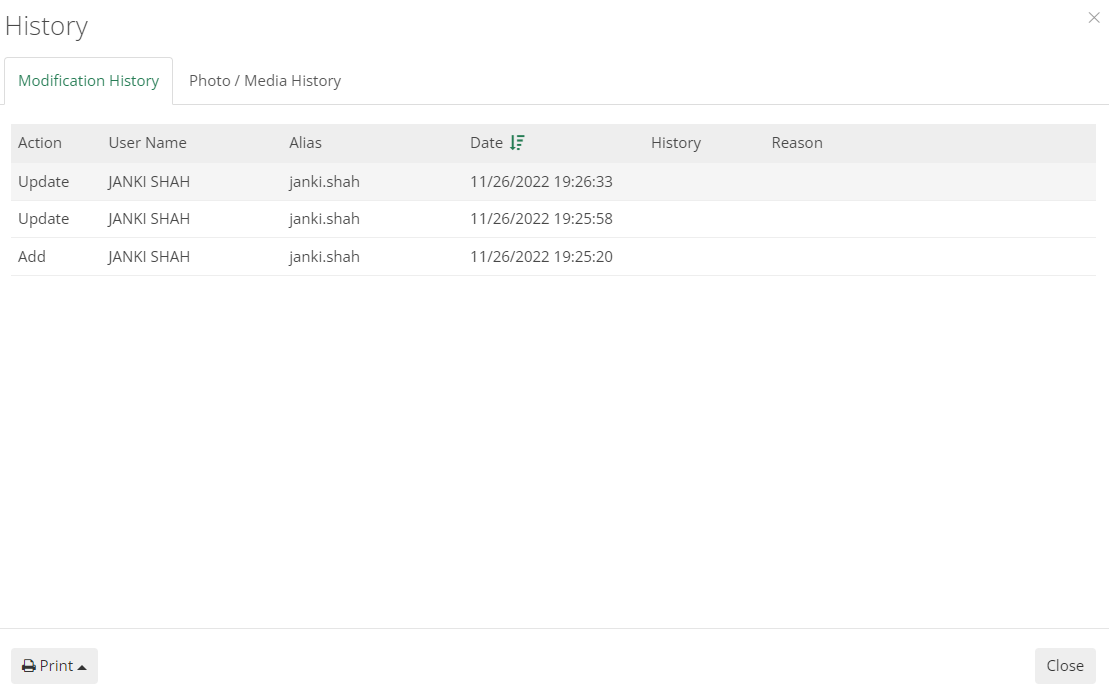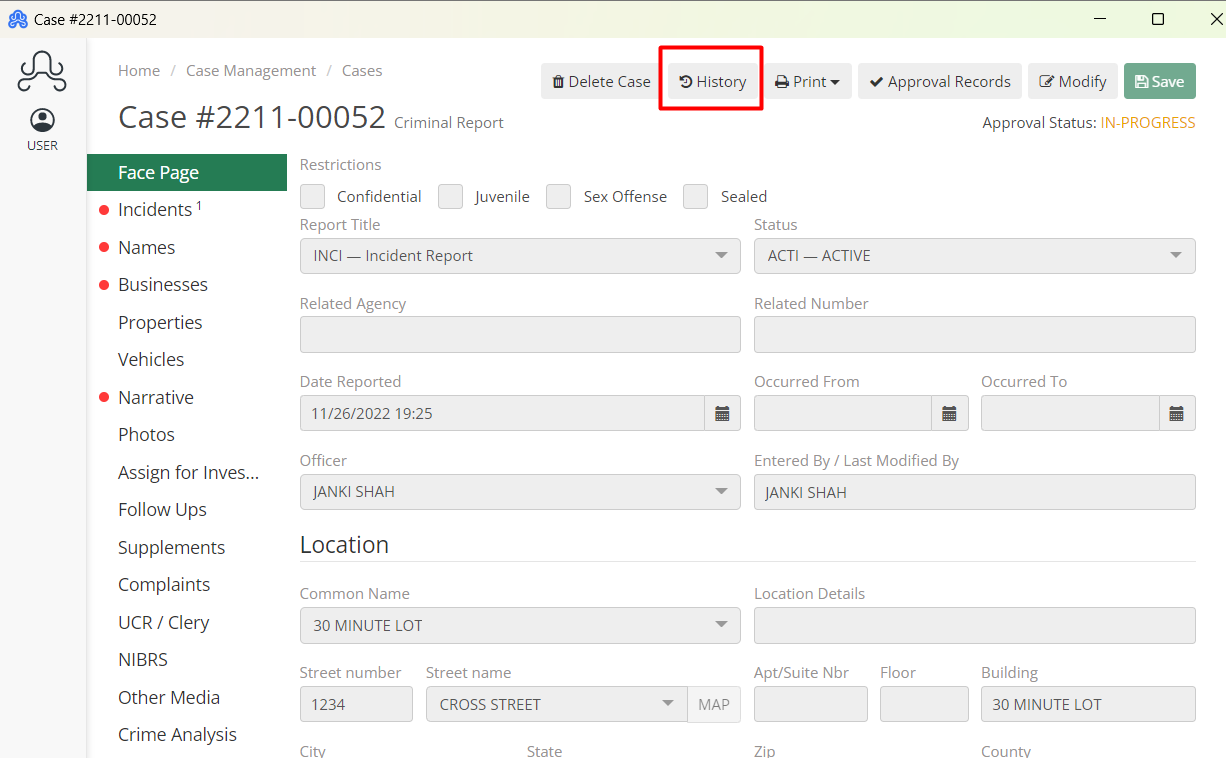 However, if the user would like to see when the last time a case report was modified user can go to Case Management -> select case number -> Click on the History button to view Modification History.