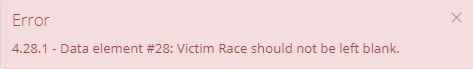 If you are receiving a "Data Element #" message when completing a NIBRS review this indicates a required field has been left blank. To resolve this behavior, go to the field left blank and fill in the correct information. In this example, there is missing Victim related data.
