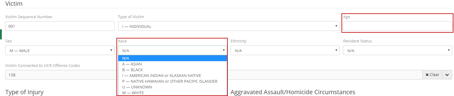 Based on the error message the user will need to click on each of the drop-down boxes to display a 'Sex', 'Race', and 'Age' for the Victim. After these details are keyed in the user will be able to save and check for any further errors in this segment.