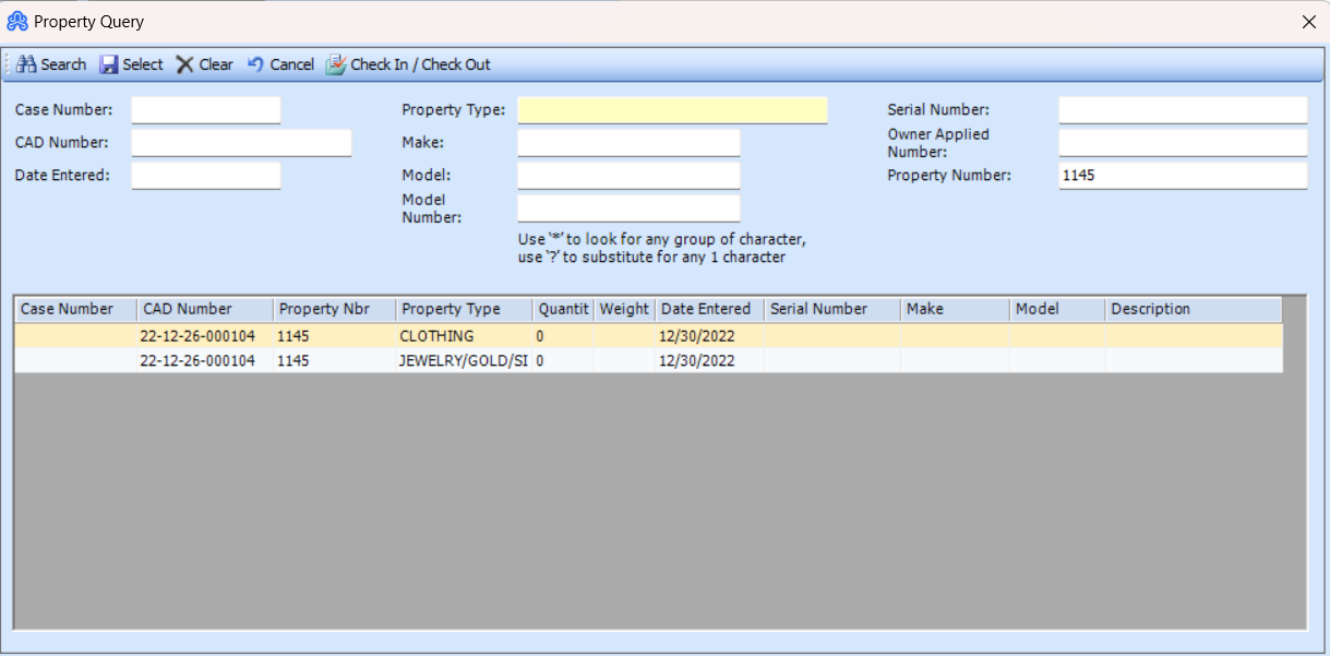 Example: Given we have three pieces of property all numbered 11145; we can query the property file (ARMS Records System>>Property/Evidence: then hit the Look Up button) for those items with a search by property number: