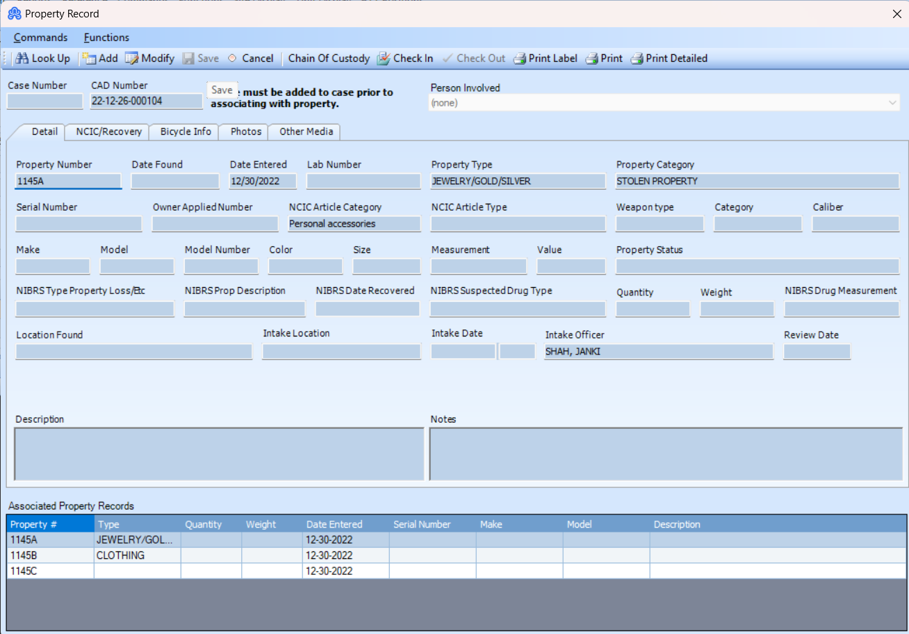It is not common to have multiple items of property with the same property numbers, whether those items were numbered intentionally or otherwise. ARMS allows these practices for those departments that would like all property items associated with a single case record or CAD event to share the same number. Doing so may offer some advantages when searching for property items by case, CAD, or property number, but at the same time, may cause some confusion.
