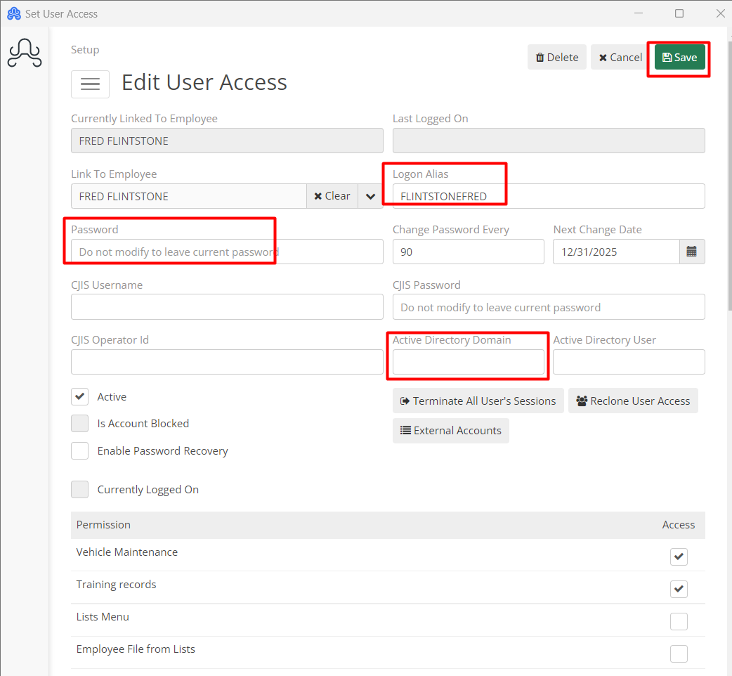 Edit the Logon Alias, Password, and Active Directory User (if applicable) for that user. Save.