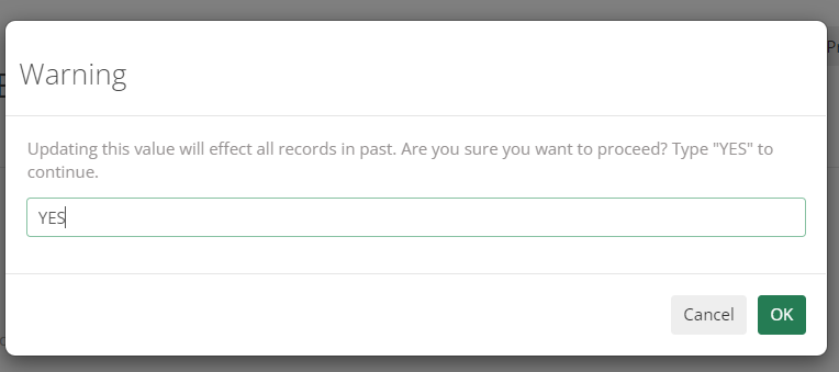 It will show a warning message, to notify the user that the changes will affect past records. Type YES to continue.