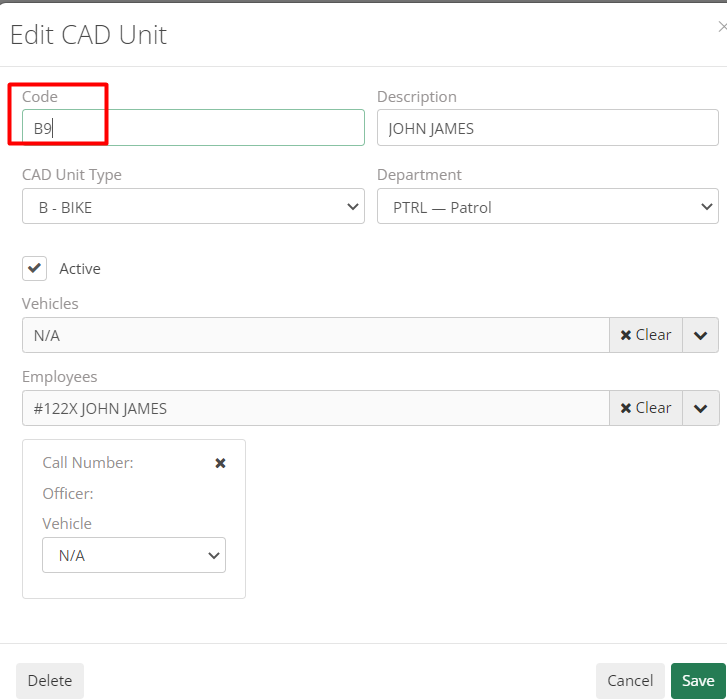 2) Setup menu >> CAD Unit >> Code field (for agencies whose CAD Unit mimics Employee names)