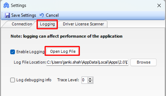 Step 2. Select the Logging tab, then select Open Log File.