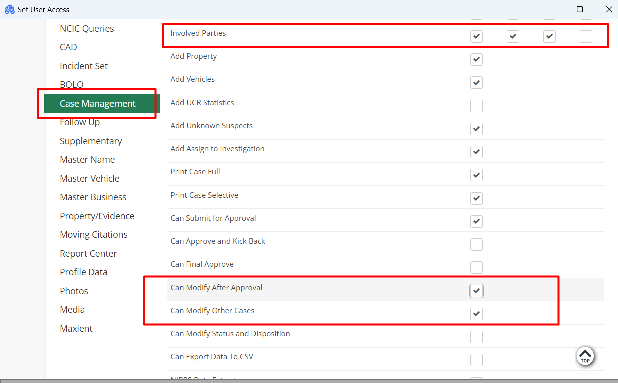 Make sure that the boxes labeled next to “Involved Parties” and “Can Modify Other Cases” are checked.